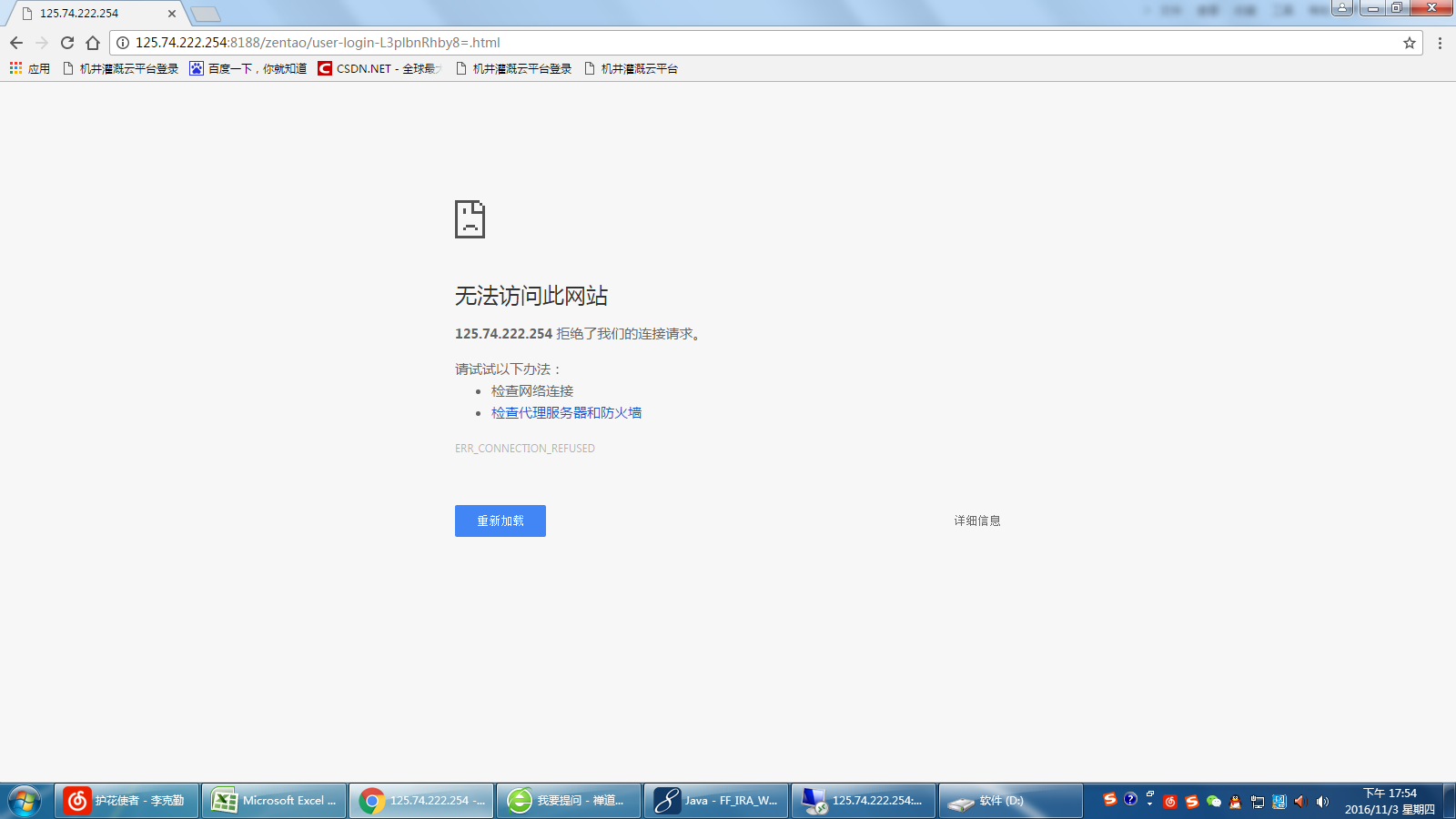 石洋洋2016-11-04 09:11:38 在不能访问的电脑上 telnet 125.74.222.254 8188 看端口是否通。 |