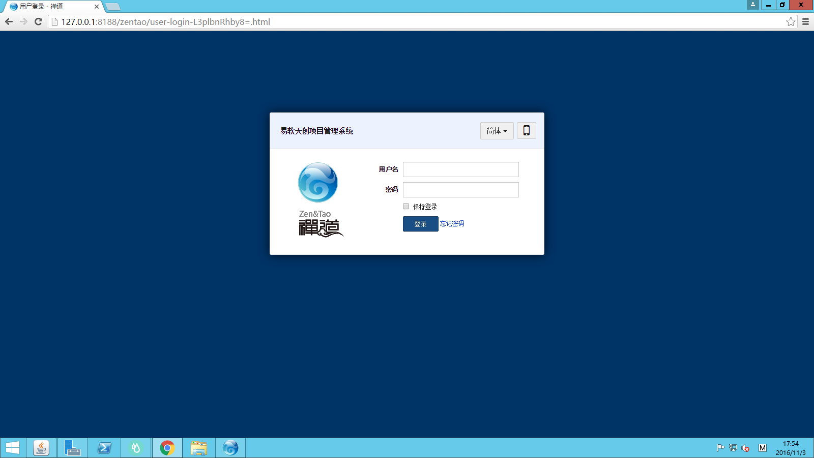服务器禅道访问地址为:http://127.0.0.1:8188/zentao/user-login-L3plbnRhby8=.html