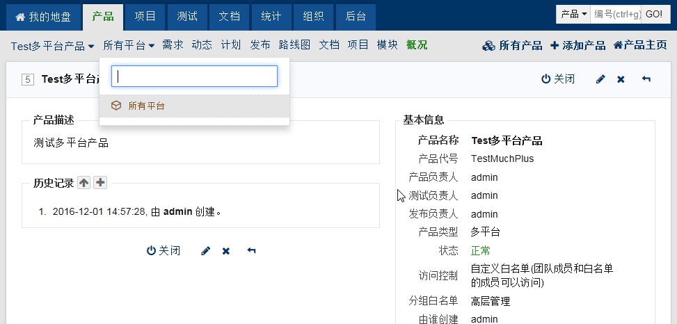 石洋洋2016/12/01 1、组织-权限-权限维护 分配 分支相关的权限,退出重新登录禅道后生效。 2、到 产品-分支/平台 下面维护。 |