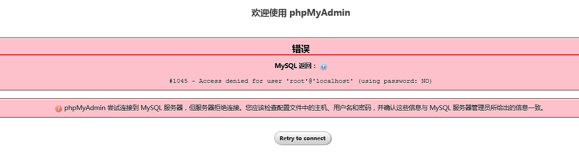 访问数据库的时候提示 #1045 - Access denied for user 'root'@'localhost' (using password: NO)已解决