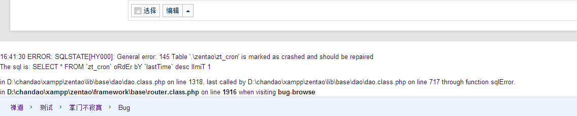 石洋洋2017/01/23 1、检查xampp/phpmyadmin/config.inc.php 中的参数是否正确; 2、数据库受损,需要登录数据库执行sql: REPAIR TABLE `zt_cron`; |