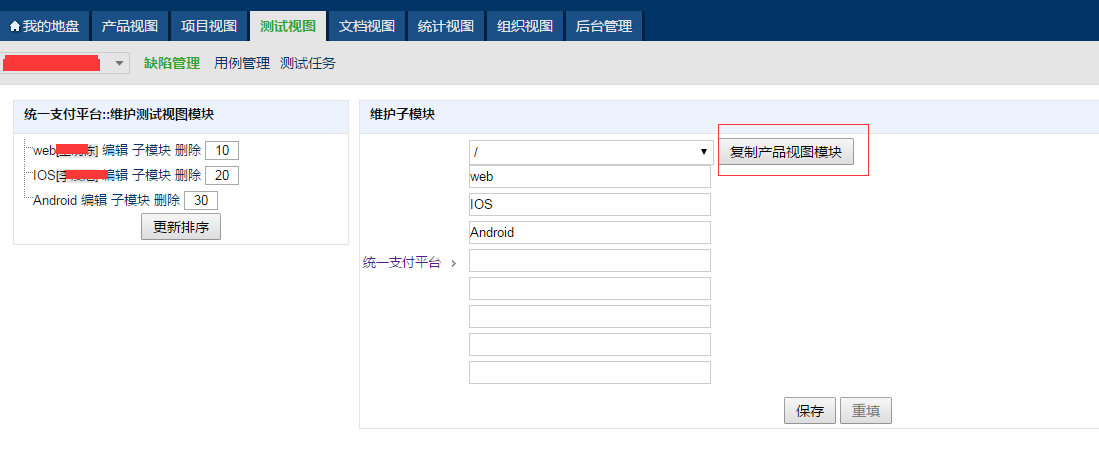 在测试模块下,进入bug中,左侧有个维护模块,一个模块如何复制另外个模块的子模块,以前老版本的复制视图功能在哪里?