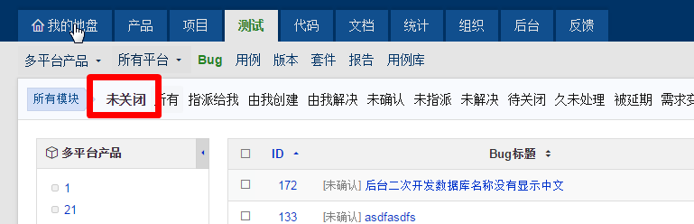 测试-bug默认是显示未关闭,如下图。项目-bug会列出和当前项目相关的bug,包含关闭的。