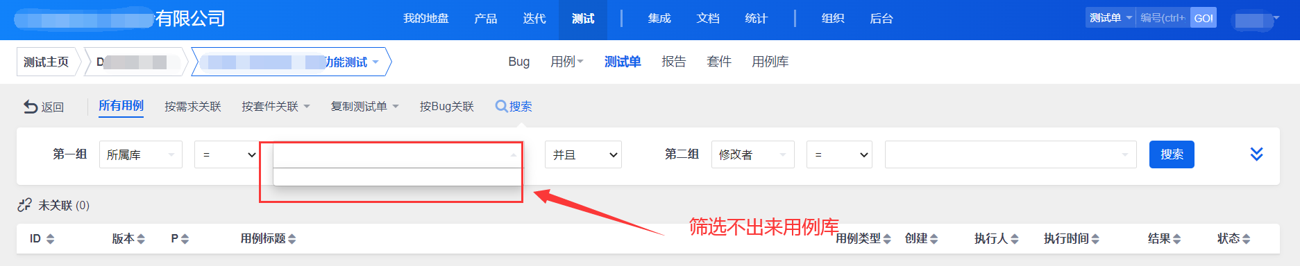 在测试单中,关联测试用例,想按照所属库筛选,发现选项为空,没有可选项: