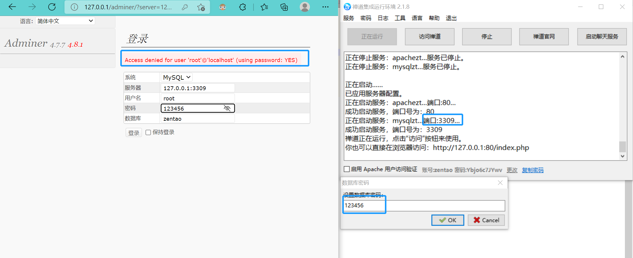 禅道无法连接到MySQL数据库,Access denied for user 'root'@'localhost' (using password: YES)