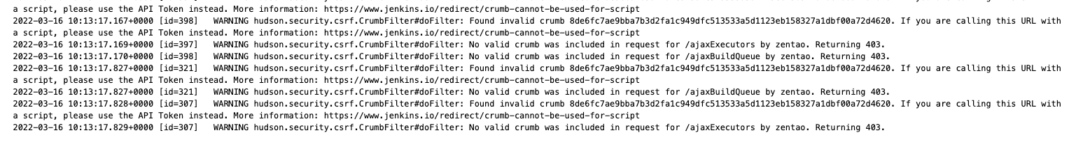2022-03-16 10:13:17.827+0000 [id=321] WARNING hudson.security.csrf.CrumbFilter#doFilter: No valid crumb was included in request for /ajaxBuildQueue by zentao. Returning 403.