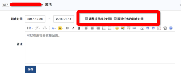 禅道-李锡碧2017-12-29 08:40:00 如提示,如果勾选调整项目起止时间,会调整项目的起止时间;如果勾选顺延任务的起止时间,任务的截止时间也会变化。如果不希望发生变化,可以不进行勾选。 |