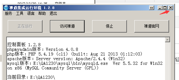 后来, 发现如果点击 下面这个窗口的 X , 程序提示 会退回到后台继续运行.....OK, 然后对禅道的网页访问都是正常;