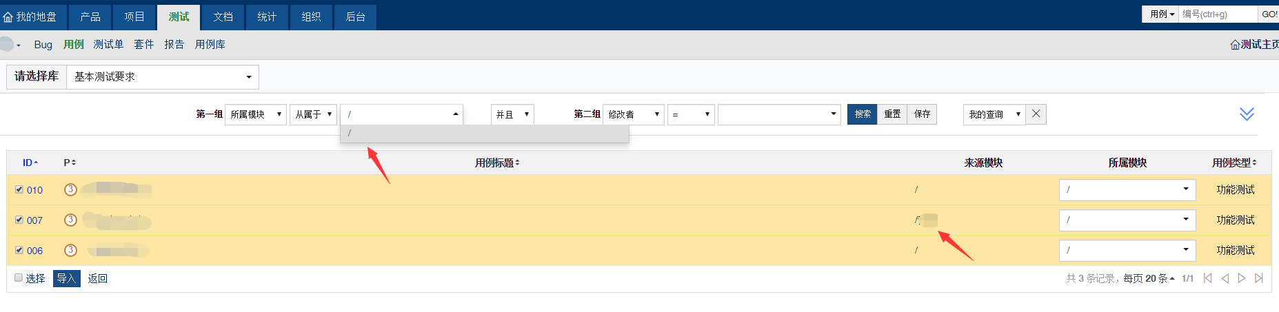如图,导入用例时,用例库中的用例有/和/xxx两个模块,但是搜索条件里所属模块列出的仅有/