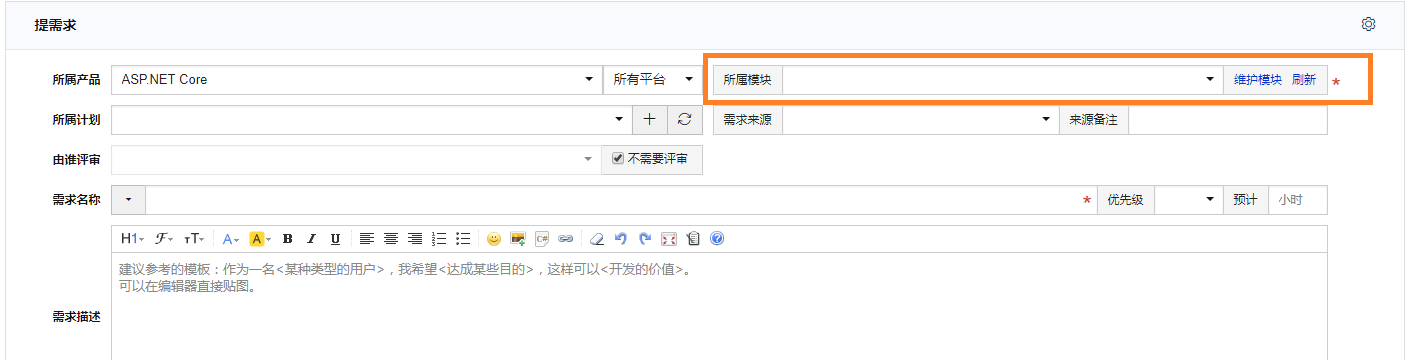 🚢 需求和bug是比较重要的信息,所以新版本中这里设置了模块为必填项,可以在产品-模块创建一个通用模块进行选择。 |