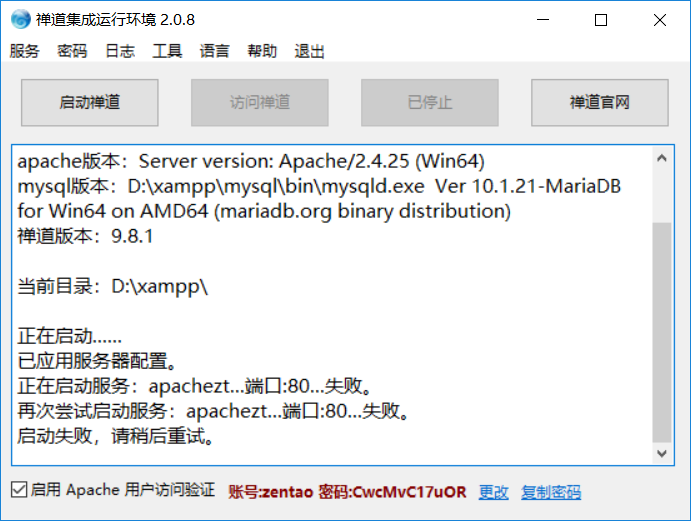 🚢 左上角 服务-卸载服务 然后 服务-配置默认端口 保存后 退出 重新以管理员身份运行 xampp/启动禅道.exe 点击 启动禅道 按照上面方式修改一下端口号试试,如果还是不行的话,看下xampp/apache/logs下有没有什么报错日志。 😎 |