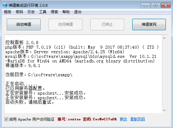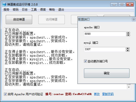 禅道-李锡碧2018-03-15 10:40:48 变更下apache的端口试试: 运行 xampp/启动禅道.exe 后 左上角 服务-卸载服务 |