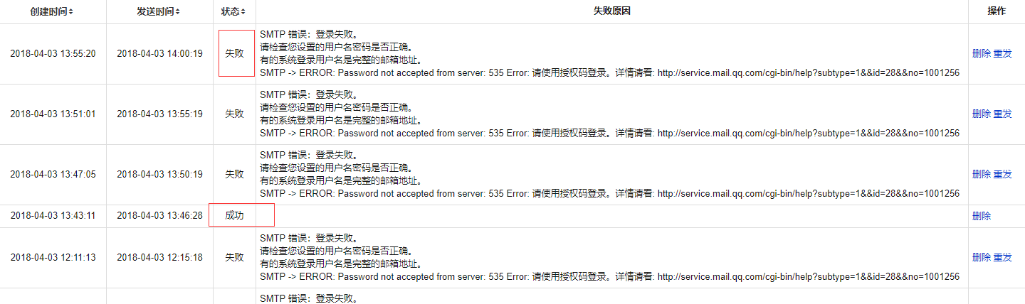给禅道设置了发送邮件的邮箱,在创建任务的时候邮件发送失败,提示帐号密码错误需要使用授权码登录(目前已经是授权码登录),在失败的邮件列表中点击后面的重发,邮件发送成功。请教一下是什么情况