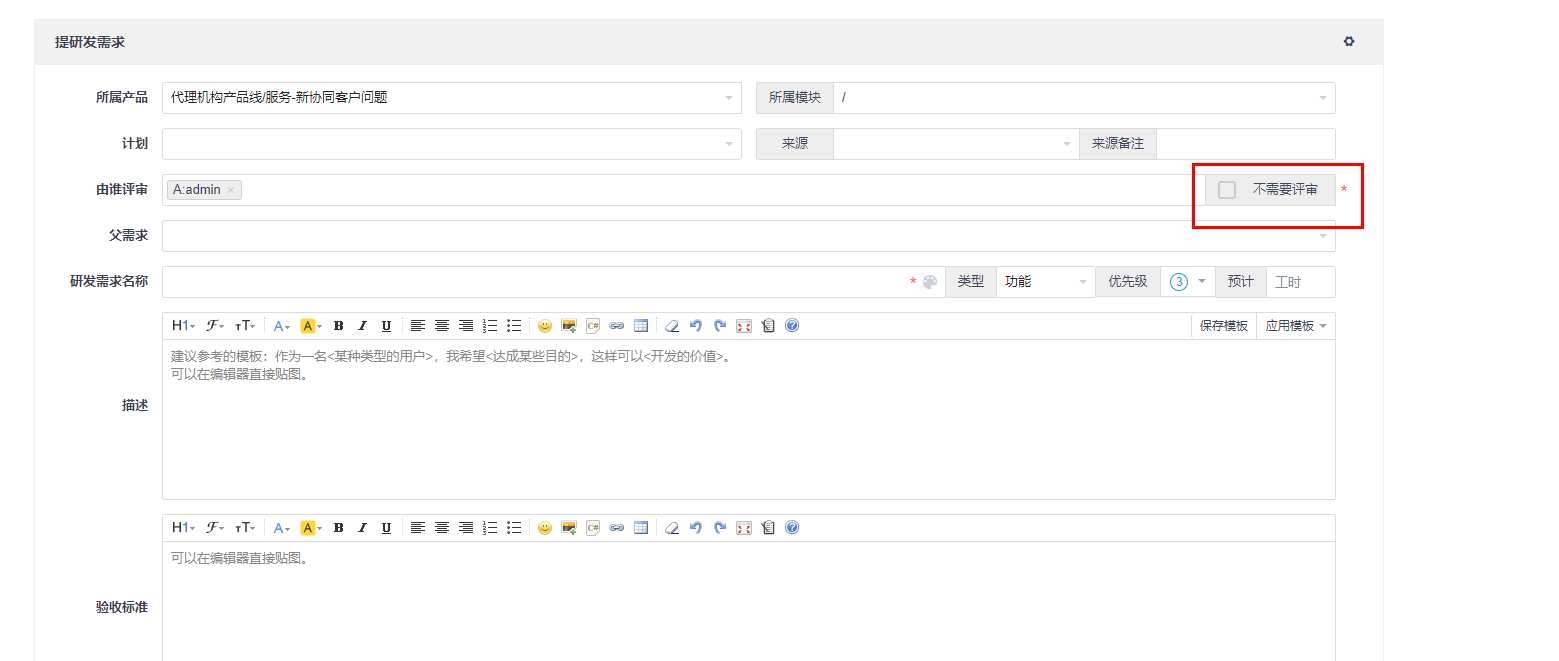 596069新建需求的时候,如何默认设置成”不需要评审“。已解决