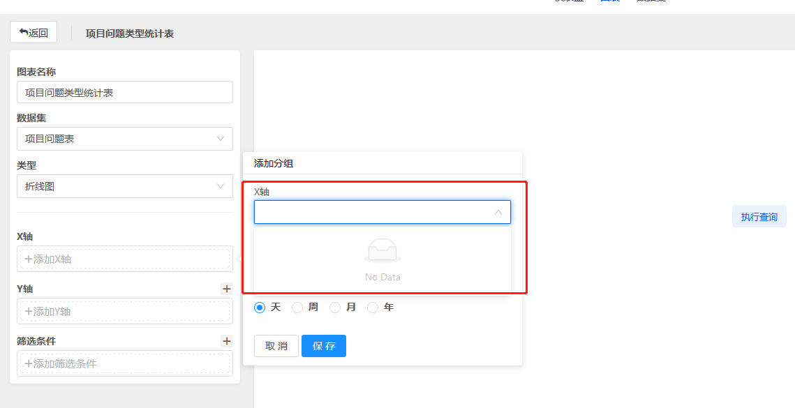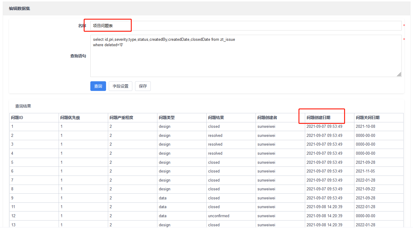 问题2:统计功能--可视化---自定义数据集通过sql查询项目问题数据的创建日期,但是在可视化图表设计成折线图的时候,X轴的创建日期调取不了。如图5,6