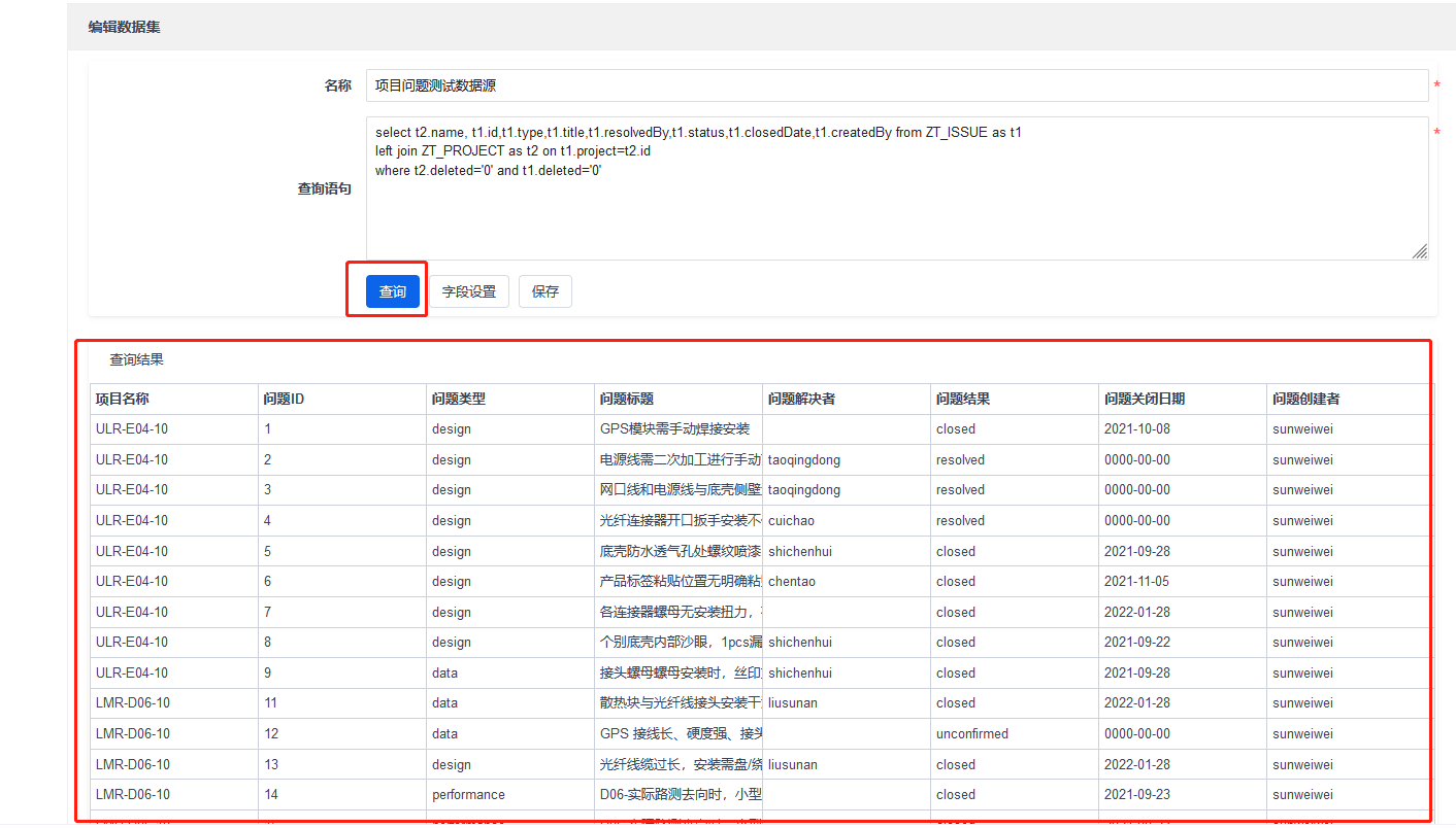 🤖 您好,这里目前有点问题,自定义数据集,查询语句,用 zt_project.id 或者 count(root) 这种字段的话,无法正常加载报表,已经记录问题后续会修复。第二个问题您可以添加首页同事,邀请到禅道交流群,协助您排查一下。 |