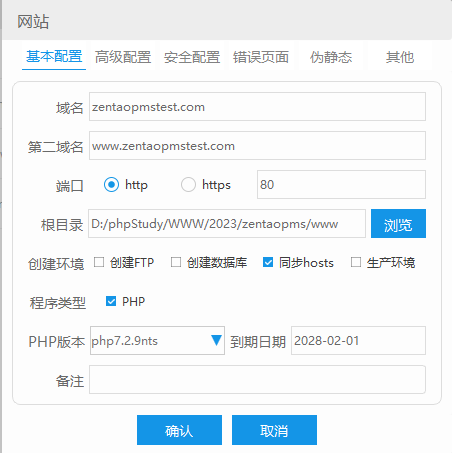 操作系统是Windows10,使用PHPstudy创建的项目,项目路径是“D:\phpStudy\WWW\2023\zentaopms\www”,PHP7.2.9,