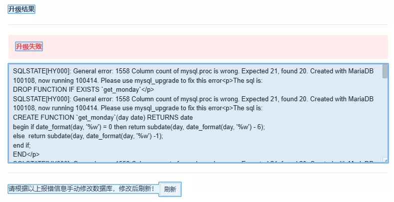 SQLSTATE[HY000]: General error: 1558 Column count of mysql.proc is wrong. Expected 21, found 20. Created with MariaDB 100108, now running 100414. Please use mysql_upgrade to fix this error<p>The sql is: