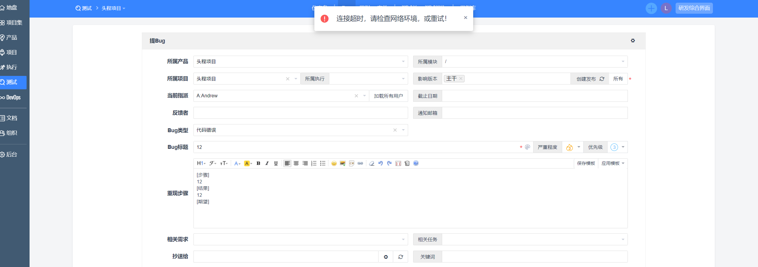 禅道-阿龙2023-05-15 10:27:17 1、提交bug是否有上传较大的附件 2、访问禅道是否有使用nginx的代理,如果有的话可以跳过代理直接使用ip+端口访问禅道看下是否还会有报错; 3、F12页面看下哪个请求有产生错误; 4、可以添加页面上方QQ,邀请进入技术交流群沟通问题。 |