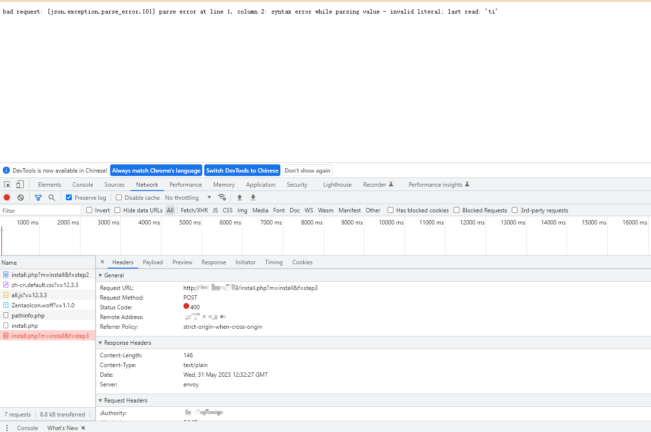 按转到第三步输入数据库密码之后进行下一步接口报400