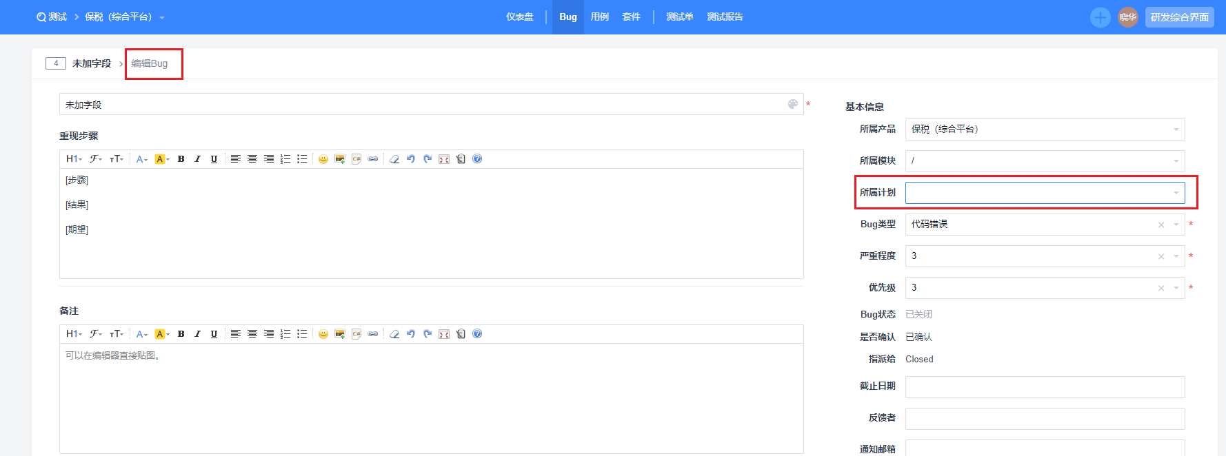 596515提BUG页面,如何添加“所属计划”字段。已解决