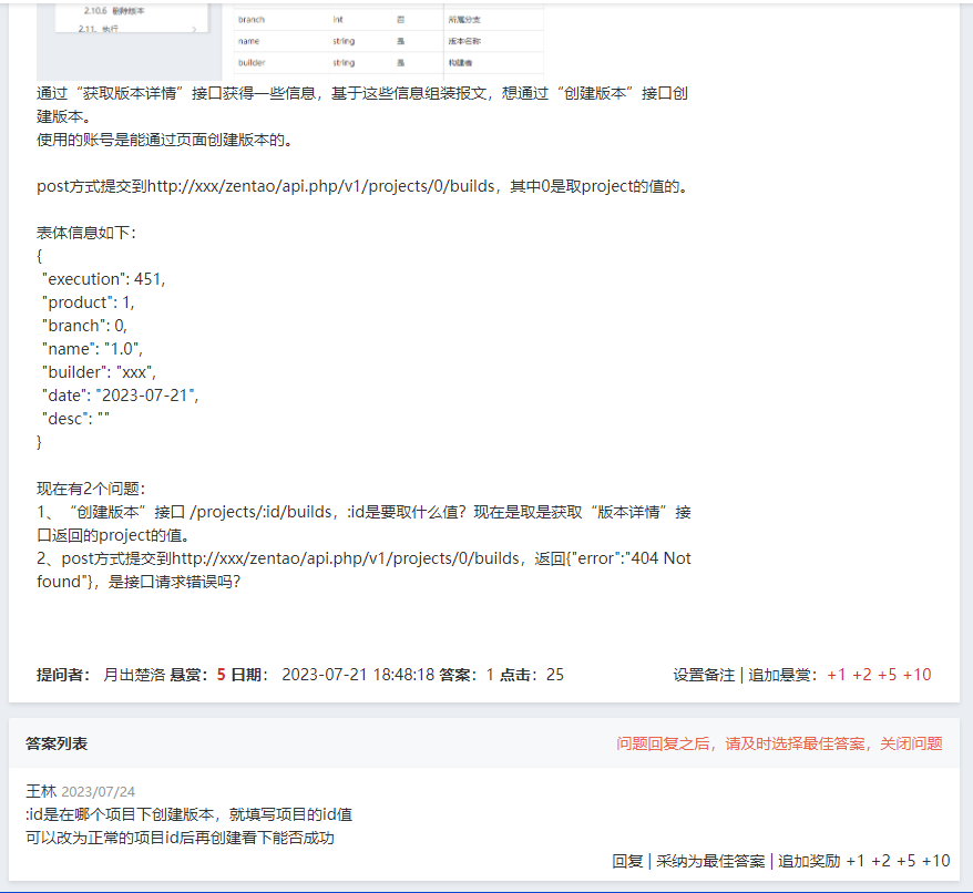 回答说:id是在哪个项目下创建版本,就填写项目的id值。这个:id是取蓝框的值(1),还是红框的值(457),我做了2个测试,见截图,都是返回404,不知道是哪里出问题了。