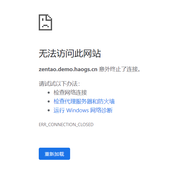 禅道-阿龙2023/07/28 https://zentao.demo.haogs.cn/ 本地测试该地址是可以正常访问的,可以检查下是否是您电脑网络问题,是否有挂载代理之类的网络设置; 18.5与18.3版本的不同可以在官网动态中查看:禅道动态 - 禅道开源项目管理软件 (zentao.net) |