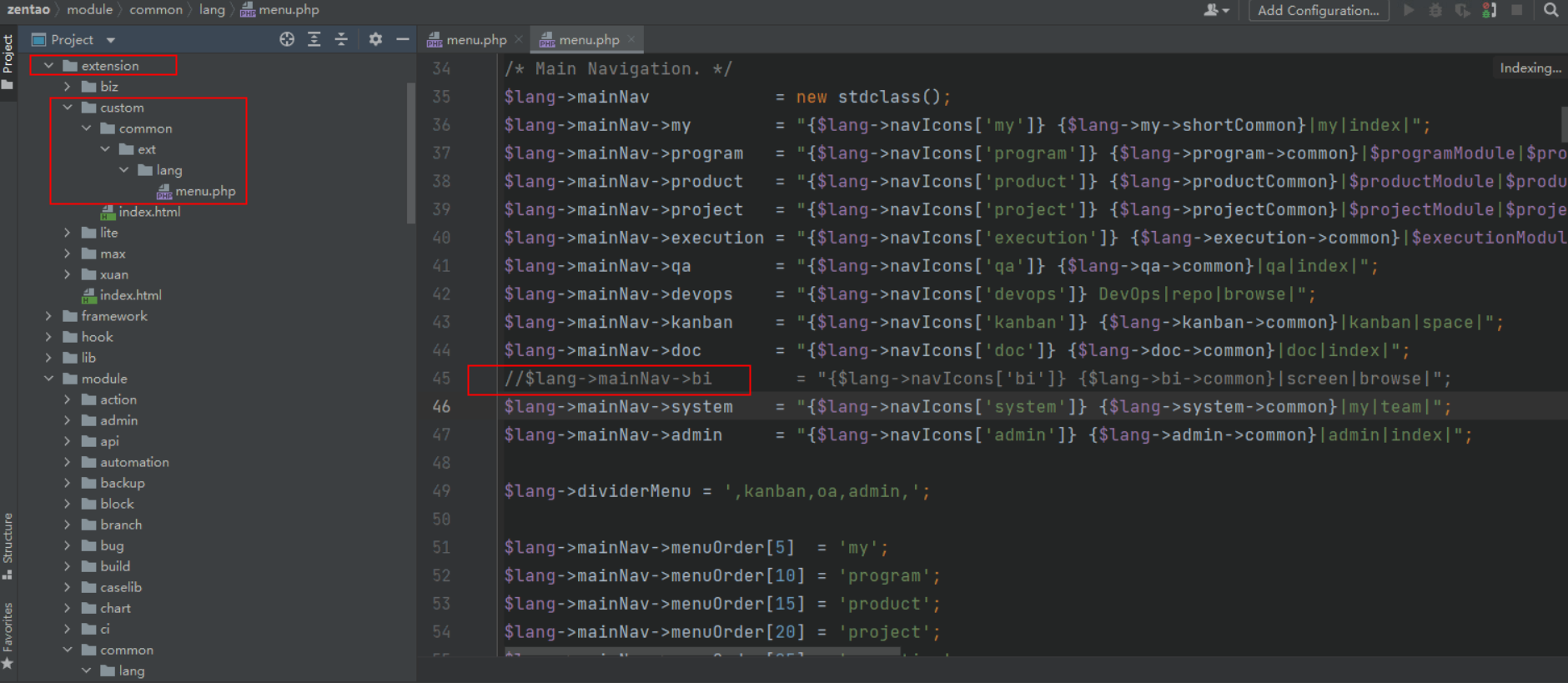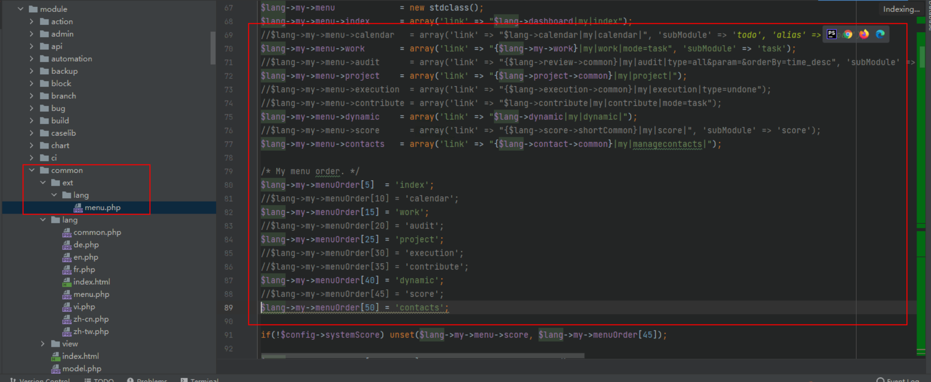 注释掉了日程、审批、项目执行、贡献、积分,希望菜单隐藏,但是没有生效,为什么呢?