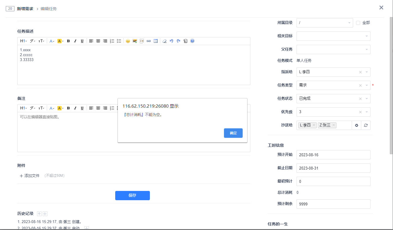 🌽 界面选择了已完成是要有消耗工时的,可以点击完成按钮记录下工时保存,不要直接编辑为完成 |