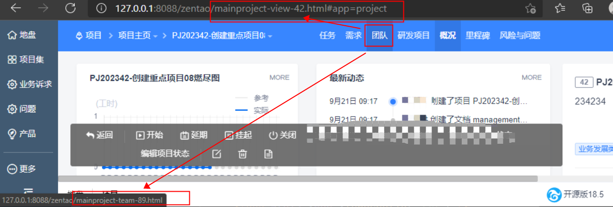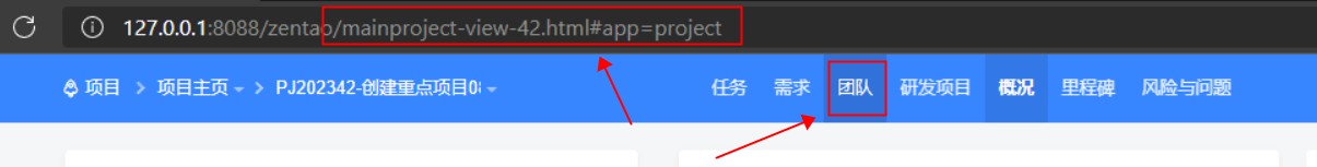 4、鼠标指向水平导航栏菜单“团队”时,左下角默认拼接链接的projectId为上次点击的项目模块(project)的projectId 89,而不是期望的重点项目模块(mainproject)的projectId 42。