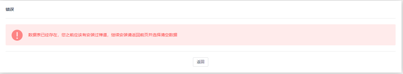 禅道-李锡碧2023-10-12 10:03:16 这是数据库中已经有了同名的表了。 如果是第一次安装的话,可以点击返回,数据库名称那勾选清理已经存在的表。然后再点击安装。 |