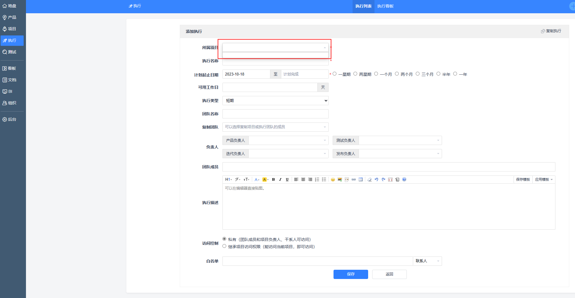 已创建好项目,但创建执行时无法选择到项目,导致不能创建执行