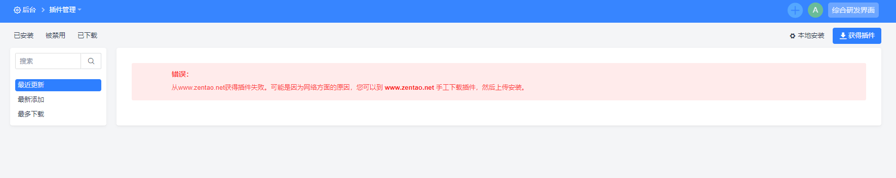 ⛄ 您好,这个提示是禅道服务器无法直接访问禅道官网,可以使用浏览器直接通过网址访问到禅道官网下载插件。 https://www.zentao.net/extension-browse.html |