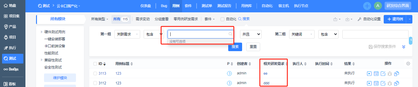 用例的搜索功能,根据关联需求下拉无选项,用例已关联相关研发需求,但仍没得选已解决