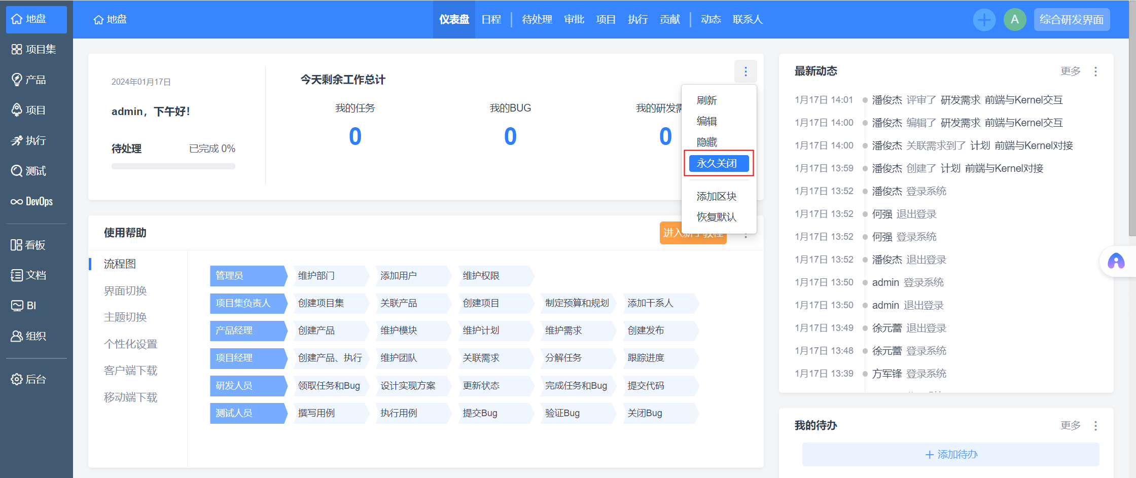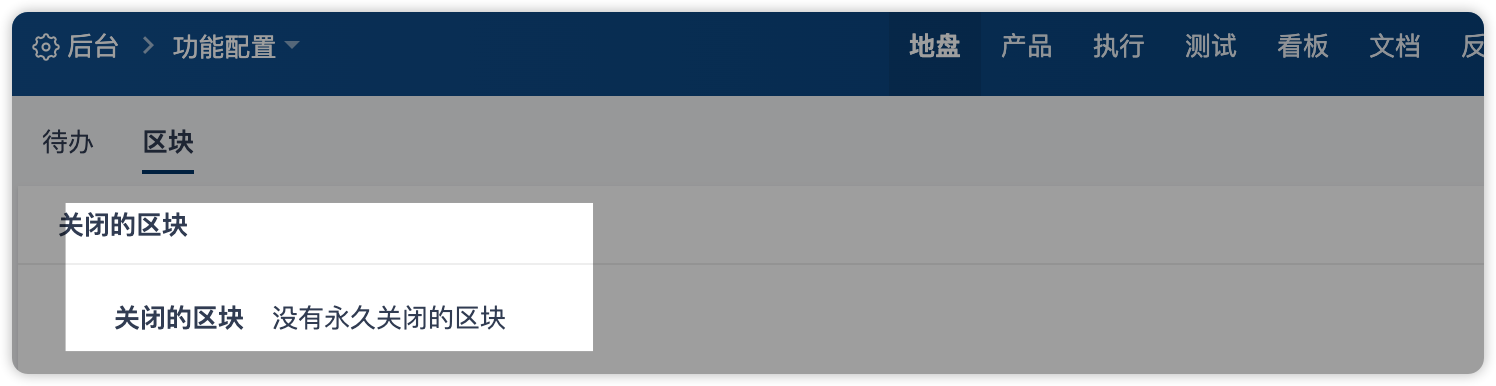 地盘中失误操作,把“待处理”区块永久关闭了,没有找到恢复的地方。禅道的文档介绍中:如果需要恢复永久关闭的区块,可以到后台--自定义--区块里恢复。但是根本找不到 后台--自定义-区块 这个地方