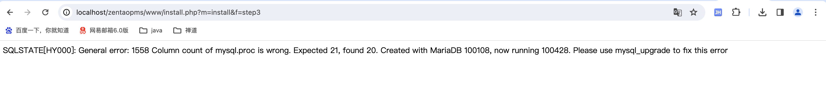 MAC下用XAMPP安装禅道,到保存[生成配置文件],报错:SQLSTATE[HY000]: General error: 1558 Column count of mysql.proc is wrong. Expected 21, found 20. Created with MariaDB 100108, now running 100428. Please use mysql_upgrade to fix this error