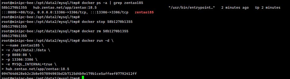 禅道-李锡碧2024/04/07 可以试试 1. docker stop 容器ID 【备份好映射的数据】2. 然后docker rm 容器ID 3. 在执行之前的启动命令,重新run一个,命令使用之前的,映射的目录还是使用之前的。