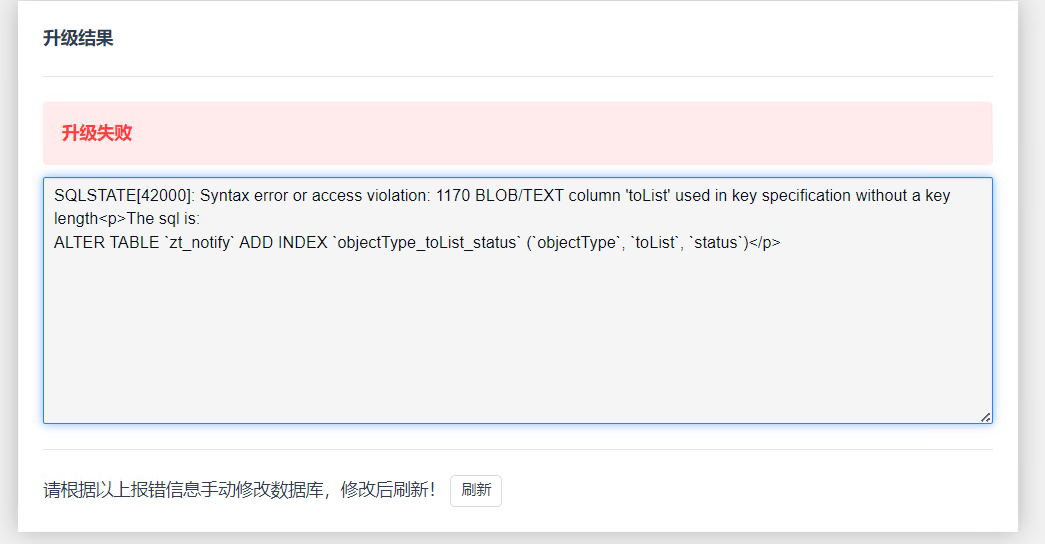 禅道-李锡碧2024-04-08 14:57:14 建议这样操作下试试: 1. 还原下升级之前的备份。 2. 先升级到12.5.3版本 3. 再升级到18.5版本 4. 最后升级到18.11版本 zt_notify表的toList字段,之前是varchar(255)类型的,再18.5版本之后,调整为text类型了。 如果还是不行,可以联系官网顶部商务QQ,邀请加入技术交流群沟通下。 |