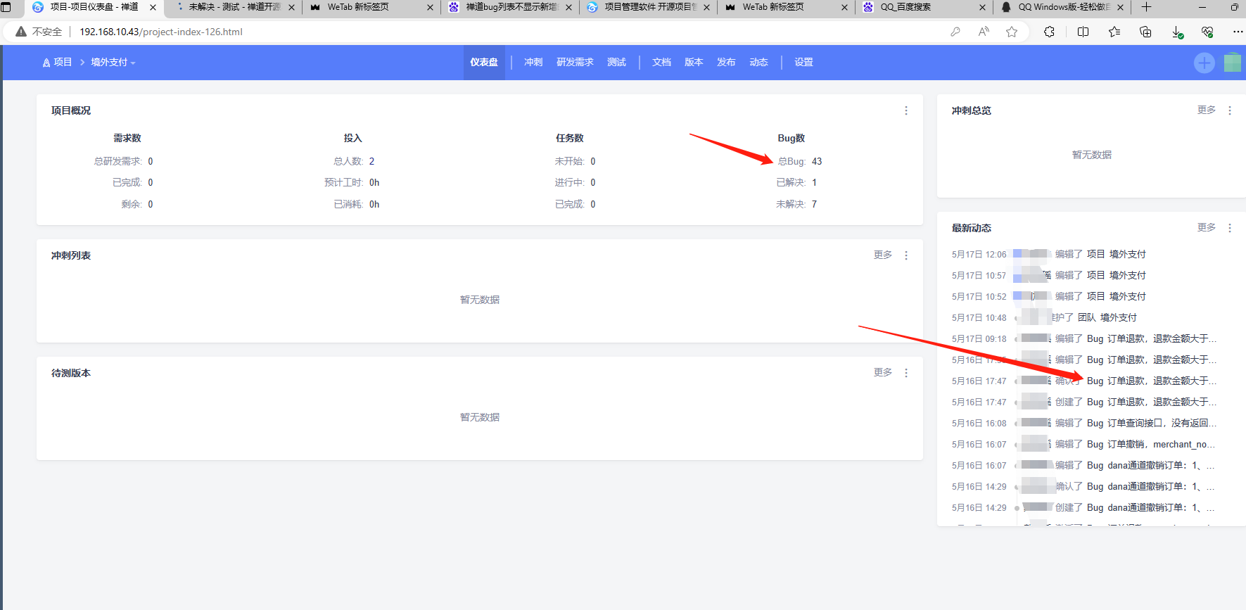 项目中可以看到当前项目一共提了多少bug以及动态信息,但是点击bug链接提示没有权限(有权限),点击测试不显示bug已解决