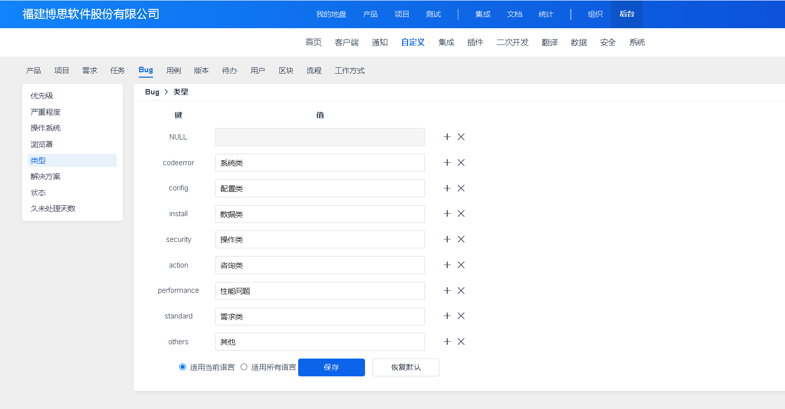 ,我在后台-自定义-bug中,只能新增bug类型,但是无法设置为必填,