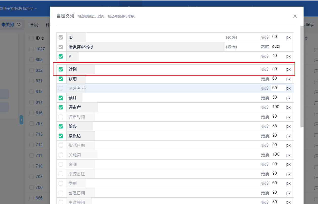 为什么我在禅道上项目中的研发需求列表中自定义列显示,在某个项目中就是 看不到【计划】的这个字段呢, 其项目上都能看到这个字段都有