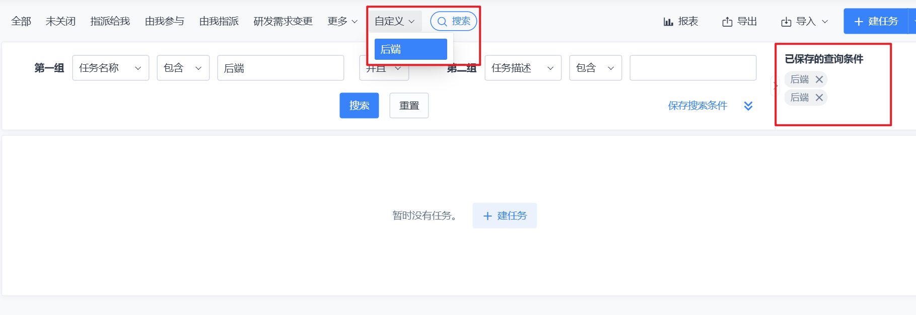 如下图:自定义中的条件查询不到数据,但是右侧已保存的搜索条件则可以查询到数据