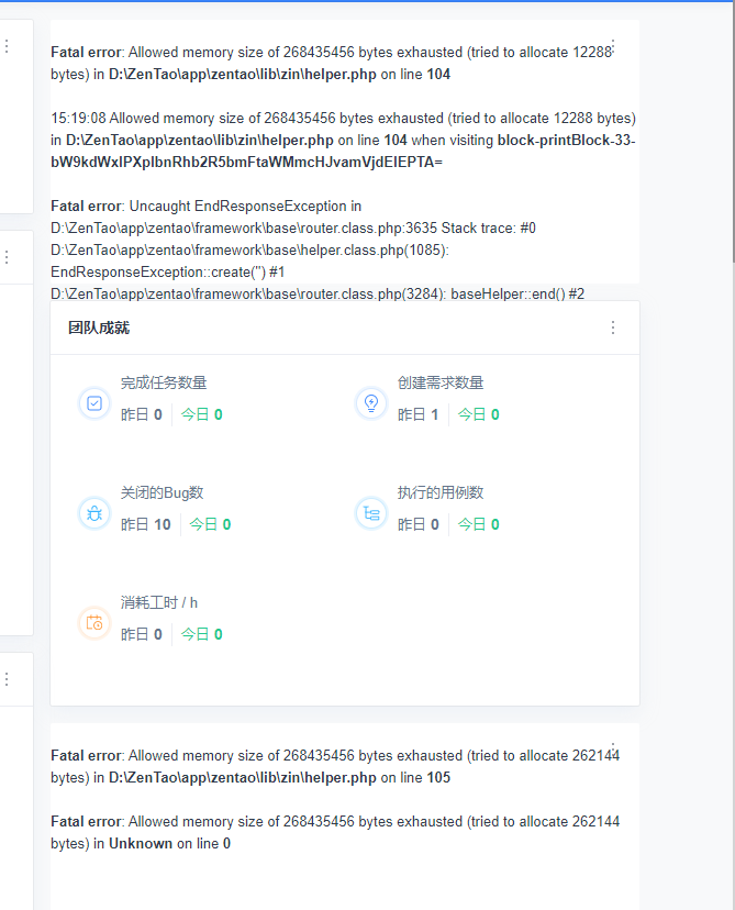 : Allowed memory size of 268435456 bytes exhausted (tried to allocate 262144 bytes) in D:\ZenTao\app\zentao\lib\zin\helper.php
