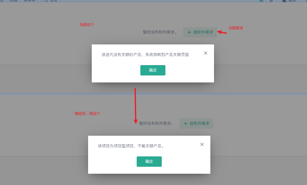 操作路径: 【执行】---软件需求 页面,点”提软件需求“,弹出提示:
