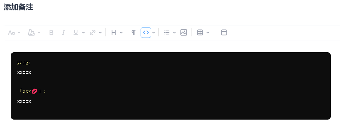 使用代码框备注一些文字信息时,粘贴过来的文字中包含了表情符号就无法提交成功,如下的内容无法提交且没有任何提示,点击备注按钮没有任何反应,删除表情符合后可以提交成功。