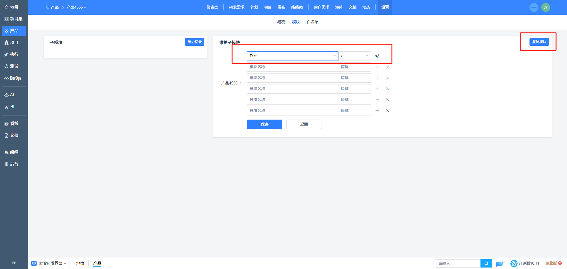 ⛅ 您好,产品的模块是需要创建完产品后单独进行维护的。 咱可以这样试下,在创建完产品后,维护模块页面有一个复制模块功能,可以一键复制其他产品的模块,方便又快捷。