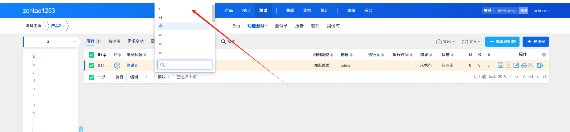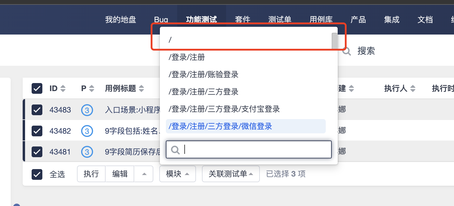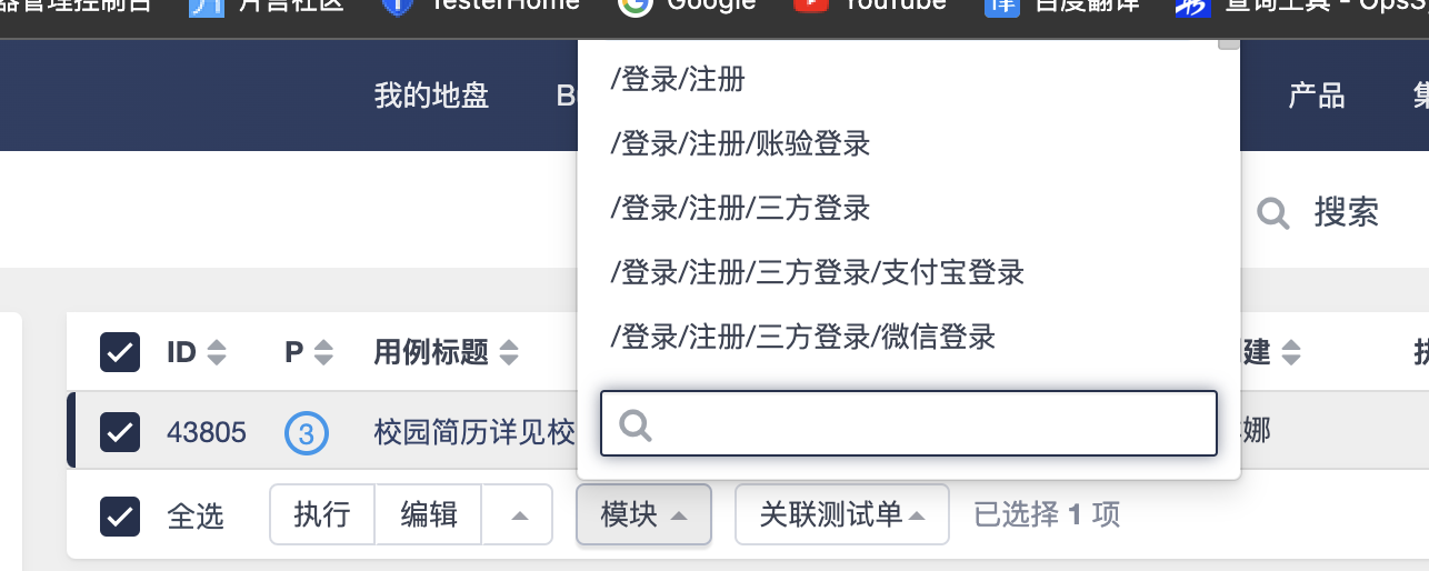 当用例列表只有一条用例时,勾选用例,展示出来的模块按钮,点击展示出模块下拉列表,最上面的模块被遮挡,没法看到