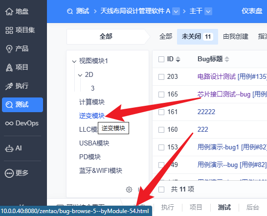 禅道-阿龙2024-08-12 15:42:32 1、创建bug获取模块的id可以通过在bug页面,鼠标指在模块名称时,左下角url byModule后面的就是模块的id值