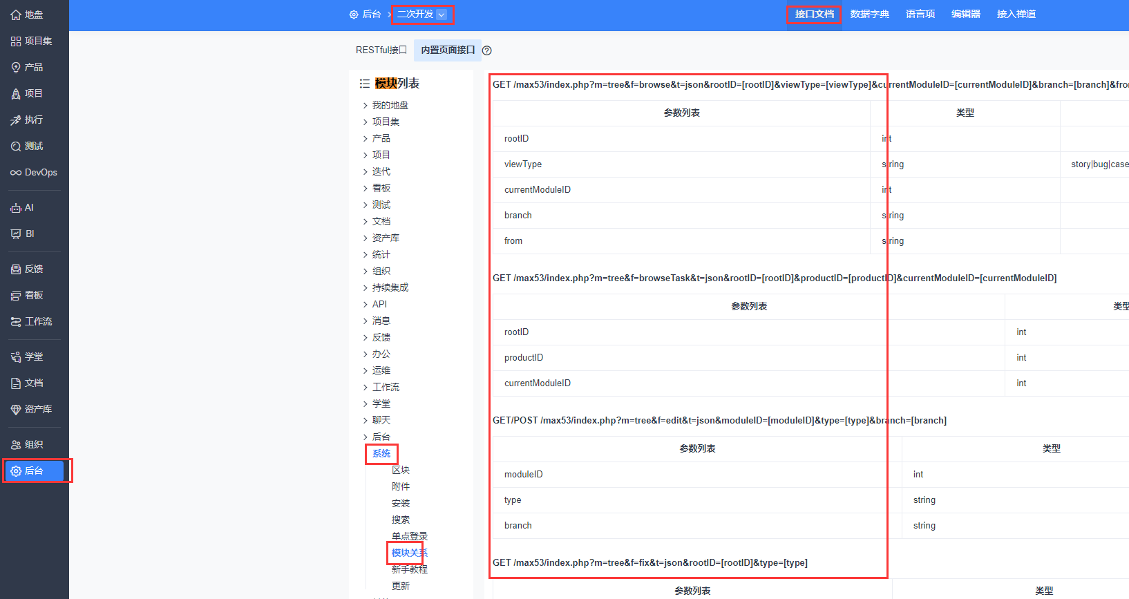 🚢 咱们可以调用一下json接口实现 登录禅道后,在后台-二次开发-接口文档-内置页面接口找一下相关接口调用 json接口调用方式可以参考文档:https://www.zentao.net/book/extension-dev/1341.html