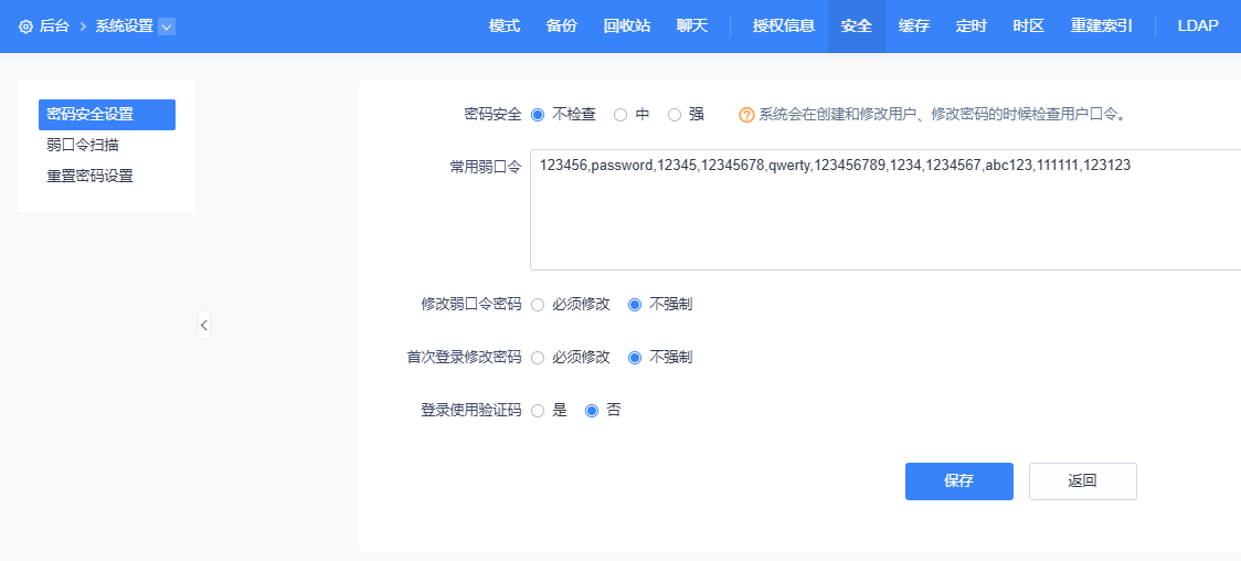 禅道-阿龙2024/11/28 admin用户登录禅道,后台-系统设置-安全中,可以设置密码复杂策略。